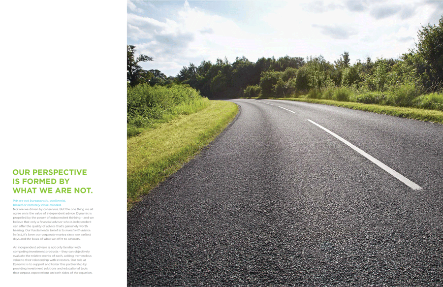 to rebrand Dynamic Funds as Canada's leading independent investment firm. My headlines drive a series of spreads all exploring the idea of perspective. Every word in this web and print project reinforces the central concept of Dynamic as an independently-minded company with valuable opinions to share.