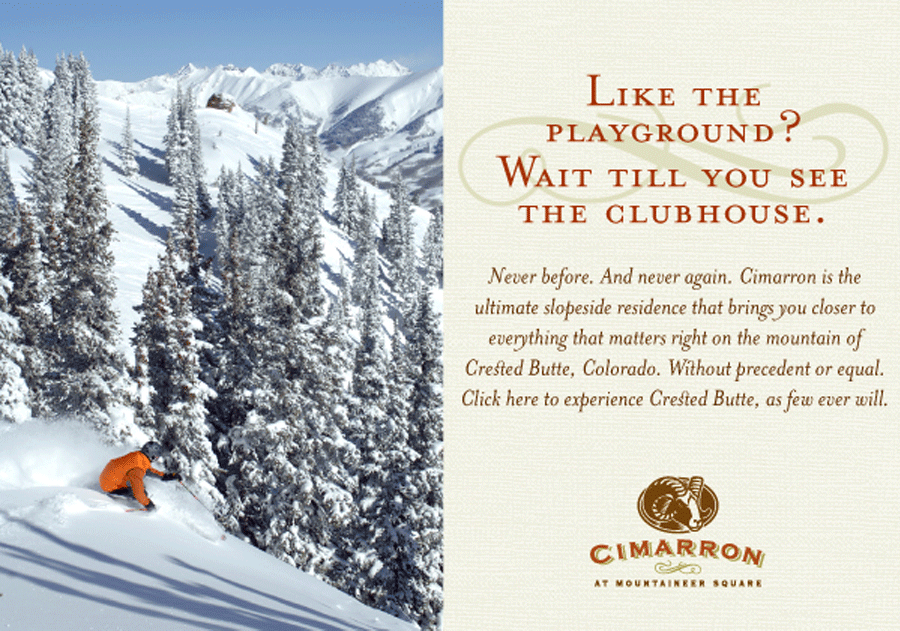 Mt. Crested Butte rises before you like out of a storybook. All cloaked in white. Every trail groomed for action. Welcome home to 9,400 feet; a 25-foot base; and the absolute best seat in the house. This is Cimarron. The one and only. And the best that will ever be on this phenomenal mountain. Nothing less than the ultimate slopeside residence set to define the legendary snowscape of Crested Butte. Now is the time to take your place – right in the very front row of this unparalleled alpine setting. One step closer to heaven than almost anywhere else on earth.