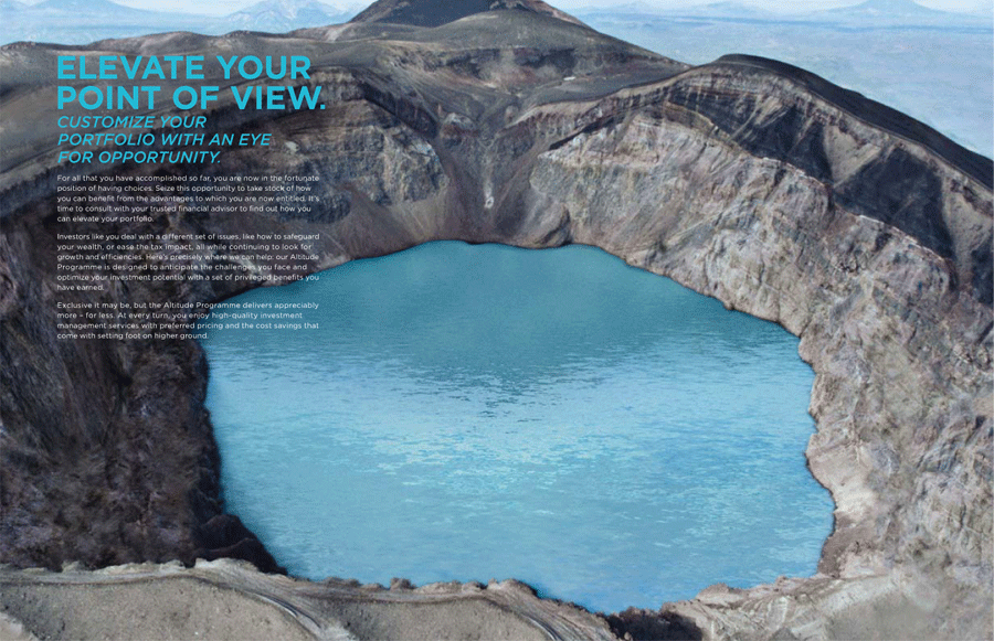 We developed this program from the ground up to create an aura of exclusivity for clients of a prestigious investment firm. From the naming of the Altitude Programme to the tagline to the look and feel of the identity, the design and copy work together hand in glove. A marvellous opportunity to create true depth and character and connect to the target from the inside out.